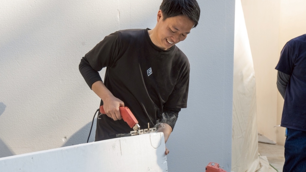 発泡スチロールは撥水性があり、腐食しにくく、カビも発生しにくい素材です。一方で、唯一の弱点と言えるのが「紫外線」です。そのため露出した状態での使用はできず、紫外線が直接当たらないよう、吹きつけ・左官・タイル張り・モルタル造形などで必ず表面をコーティングして仕上げる必要があります。